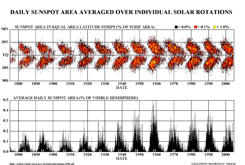 The sun has some interesting bio-rhythms. The most prominent is the 11 year sunspot cycle. This cycle, first identified by Heinrich Schwabe in 1843 and later refined by Johann Rudolph Wolf in 1847, involves the slow rise and fall of solar activity as reflected in the numbers of sunspots seen on the solar disk (photosphere). The sun is now on the upward side of this cycle, which peaked around 2001. The now famous Wolf Index (OK, only if you are really in to astronomy) developed by Wolf in 1848, is still in use today with minor modifications as a standard method of counting sunspots and thus provides a consistent historical record of solar activity dating back over 150 years. Annual sunspot counts can actually be derived from data dating back to around 1700 and records of sunspot observations have even been traced