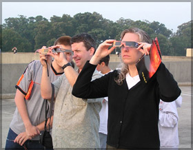 Viewing with Protection -- Experts suggests that one widely available filter for safe solar viewing is number 14 welder's glass. It is imperative that the welding hood houses a #14 or darker filter. Do not view through any welding glass if you do not know or cannot discern its shade number. Be advised that arc welders typically use glass with a shade much less than the necessary #14. A welding glass that permits you to see the landscape is not safe. Inexpensive Eclipse Shades have special safety filters that appear similar to sunglasses, but these filters permits safe viewing. Eclipse shades are available through retailers listed at http://www.mreclipse.com/Totality/TotalityApC.html under "Solar Filters."