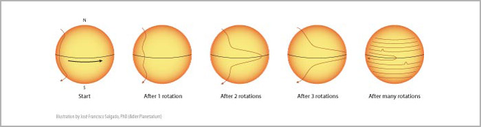 To understand the role of solar rotation (and so, sunspots) in our story, we go back to the 1820's where Michael Faraday, impressed with the work of Hans Christian Oersted who discovered that a magnetic needle (compass) was deflected when placed near a wire with a current flowing through it, developed a theory of electromagnetic induction. Basically, the movement of charge generates a magnetic field and a moving magnetic field generates charge or electrical current. This is the principle behind all electric motors, transformers, and generators today and is the principle that allows the sun to generate a magnetic field. It is also a most central concept in understanding how the solar wind and solar storms impact the rest of the solar system.