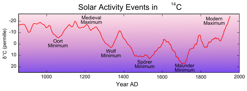 The shape of the sun's corona changes during this cycle. The shape of the corona is determined by the sun's magnetic field. High energy galactic cosmic rays (GCRs) from violent cosmic events such as super nova explosions are scattered by solar wind particles. Since the solar wind is emphasized during periods of high solar activity, fewer cosmic rays enter the inner solar system and so our atmosphere. Interactions between cosmic rays and Earth's atmosphere produce increased levels of Carbon-14 (14C). This increase in Carbon-14 provides historic records of solar cycles dating back many thousands of years. These records indicate that we are now in a relatively high period of overall solar activity and that many disruptions in the solar cycle have happened in the past. For reasons still not well understood, these disruptions (e.g. Maunder Minimum) have in some cases been correlated with decreases in global temperatures and even mini ice ages.