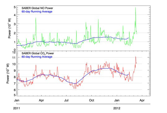 Figure 16: A surge of infrared radiation from nitric oxide and carbon dioxide molecules on March 8-10, 2012, signals the biggest upper-atmospheric heating event in seven years. Credit: SABER/TIMED